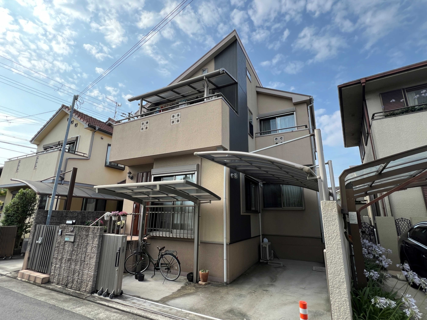 コメント:旧塗膜が弾性塗料ということで、今回の塗装には注意が必要でした。基本的に再度弾性塗料を使用するか、またはエスケー化研さんのアンダーサーフDSを下塗りに使用するかというものです。仕上げ塗料もできるだけ膨れの要因を少なくしたいため、艶消し仕様にすることになりました。サイディングのシーリング箇所の劣化も目立ち、合わせて補修と塗装をしています。屋根は塗装ができない状態ではありませんが、将来的なことを考えカバー工法で補修をすることにしました。前回の工事の不具合箇所など多数あり、施主様も悩まれておりましたが、最後には笑顔で喜んで下さったのが印象的でした。
